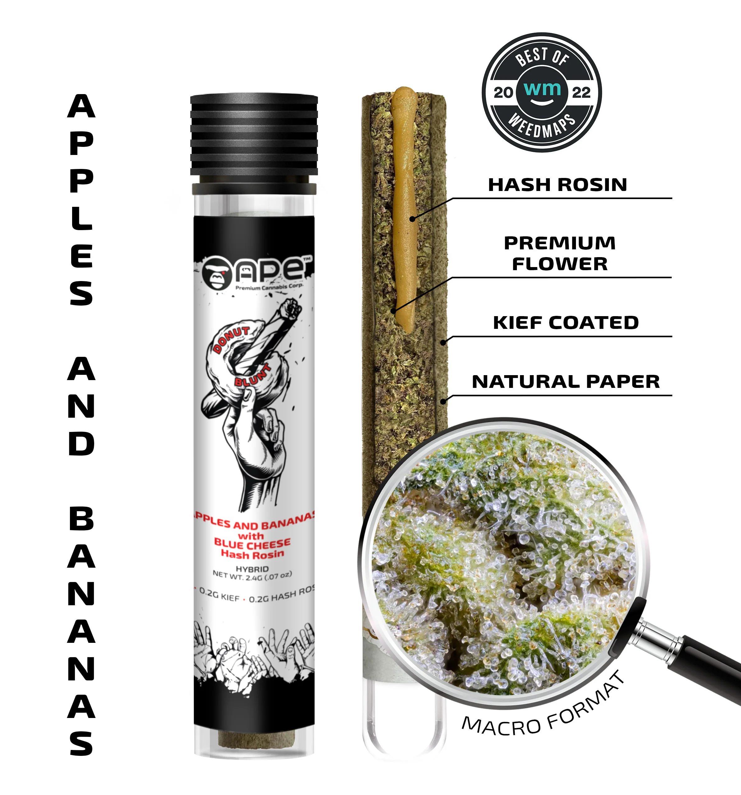 Apples and Bananas, known for its sweet and fruity flavor, brings a cerebral high that stimulates creativity and uplifts the mood. Blue Cheese, with its distinctive savory aroma, counters with a relaxing body high that soothes and calms. Hand-rolled with a glass filter for purity and smoothness, this pre-roll promises a unique and satisfying session, perfect for both social engagements and introspective moments.